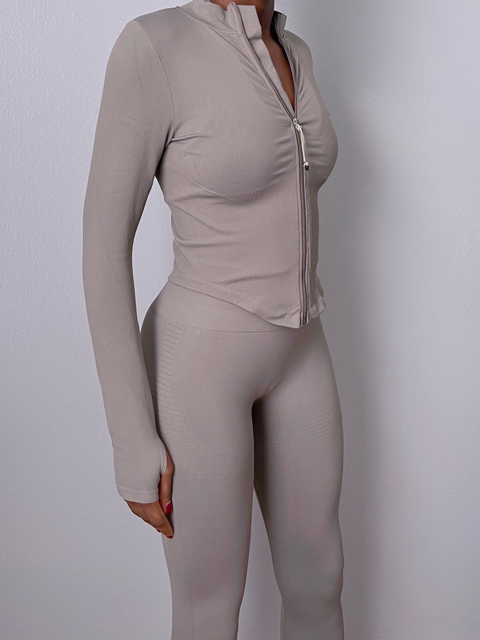 This seamless active set combines performance and style, featuring high-waisted butt scrunch leggings, a tummy-control halter sports top with a built-in bra, and a sleek long-sleeve jacket with thumb holes. Made with high-quality, breathable fabrics, this set offers a sculpting fit that enhances your curves while keeping you comfortable and supported throughout any activity.